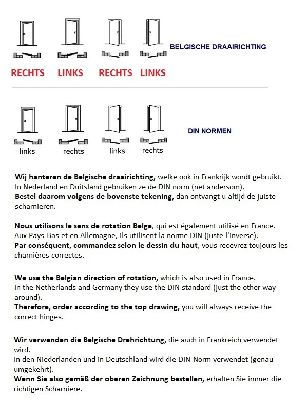 NOTE: Belgium uses a different rotation direction than the DIN standard. Therefore, order only using the enclosed drawing. This way, you always receive the correct hinges.