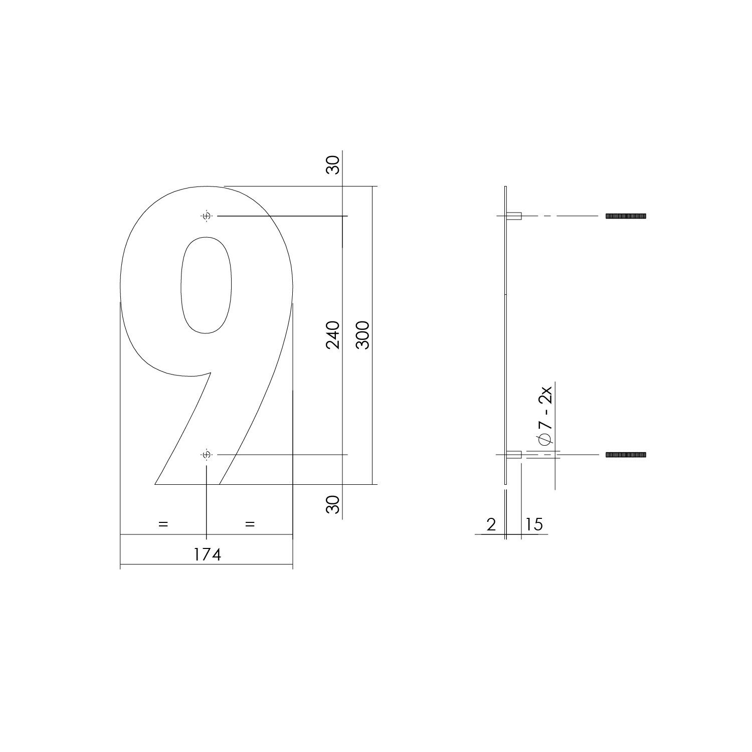 It has a height of 300mm and a thickness of 2mm. When mounted, the house number is 15mm from the wall.