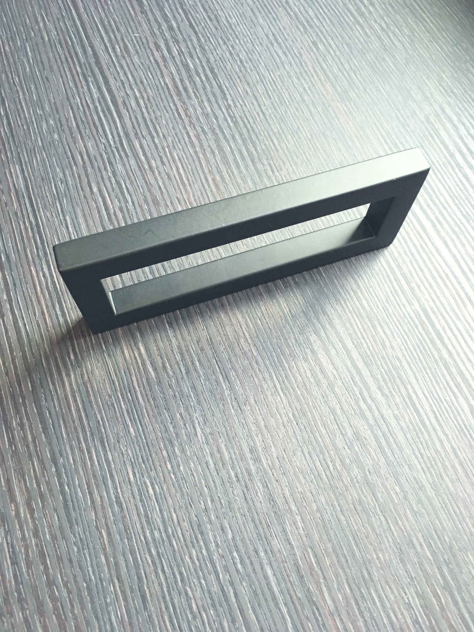 This small stainless steel look door handle is completely rectangular in shape and must be secured through and through.