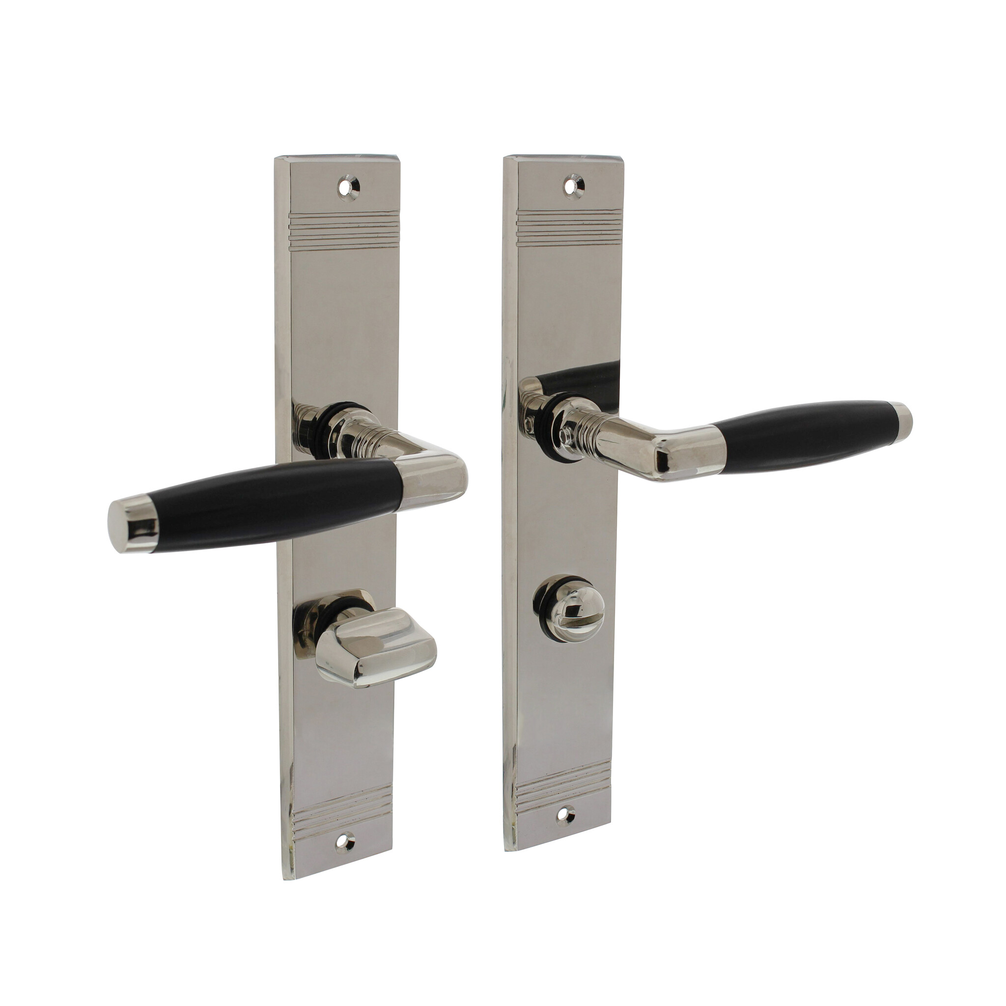 Door handle 'Ton Basic' with shield is made of nickel and subsequently polished, giving it a shiny appearance. The combination with an ebony grip gives this door handle a special look.