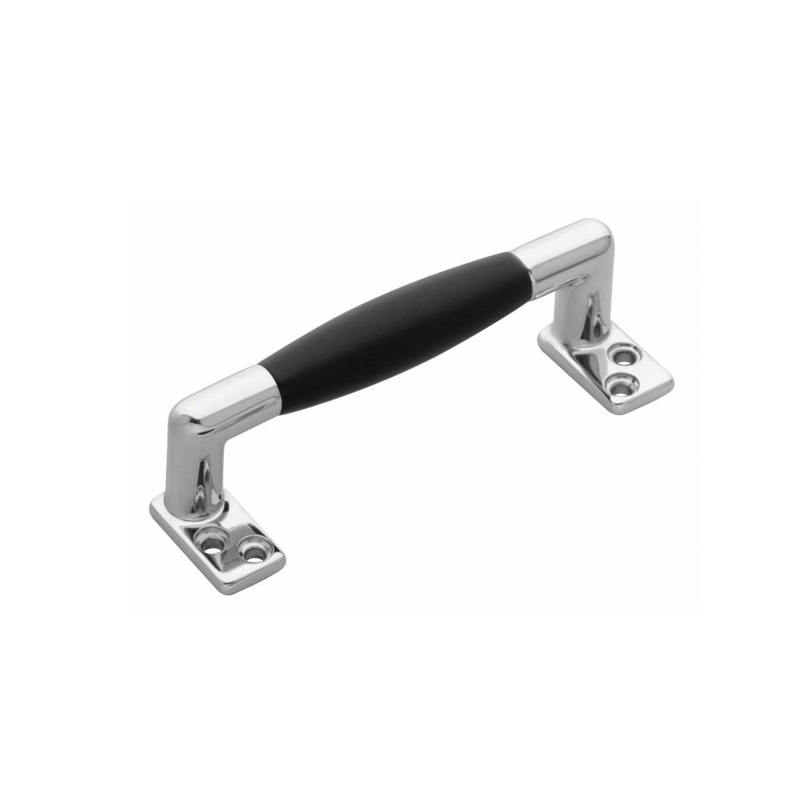 This sleek furniture handle on a square screw-on foot is made of chrome and black ebony. This furniture handle has a width of 108 mm and is supplied with mounting material.