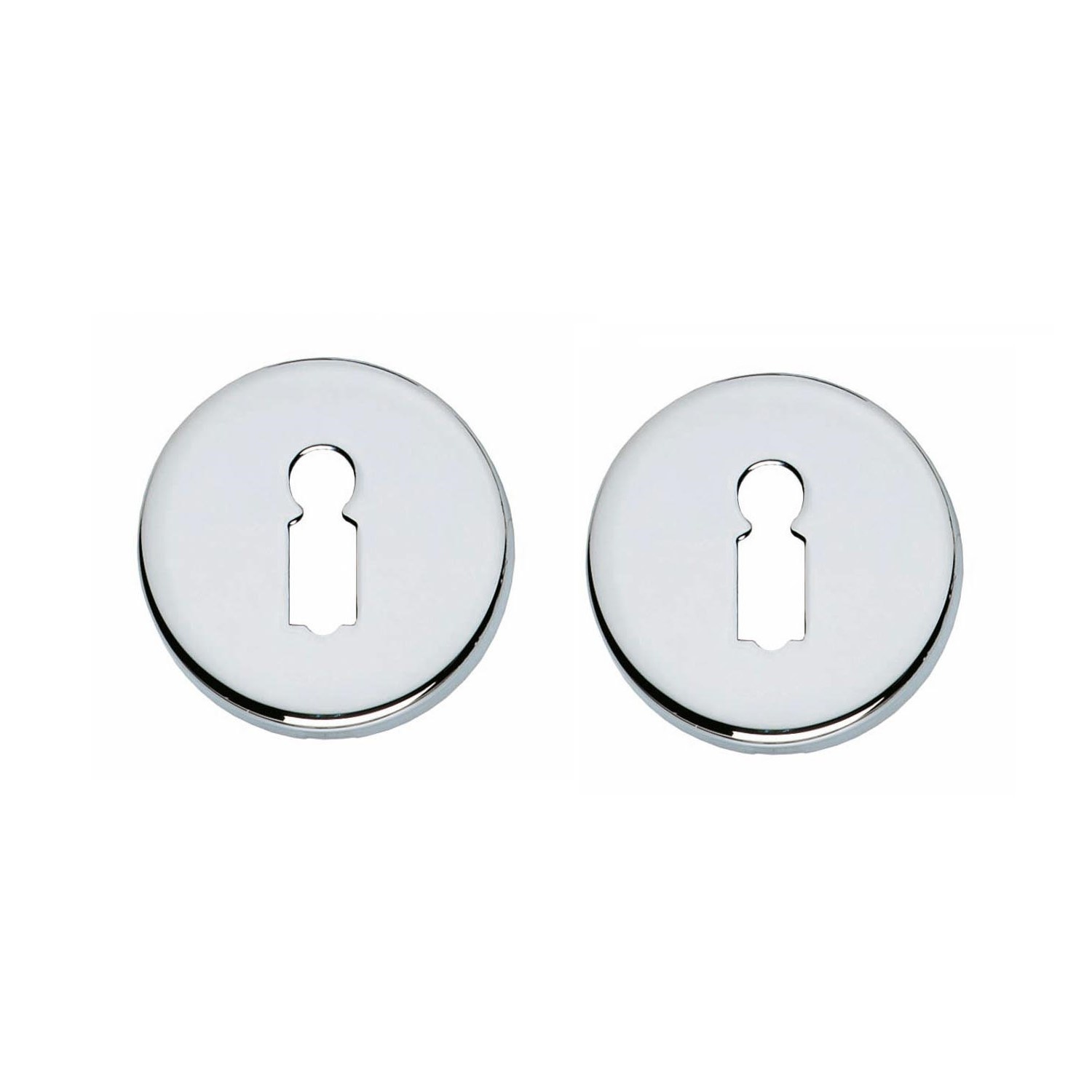 This pair of round keyhole rosettes are finished in chrome and are subsequently polished, giving them a shiny appearance.