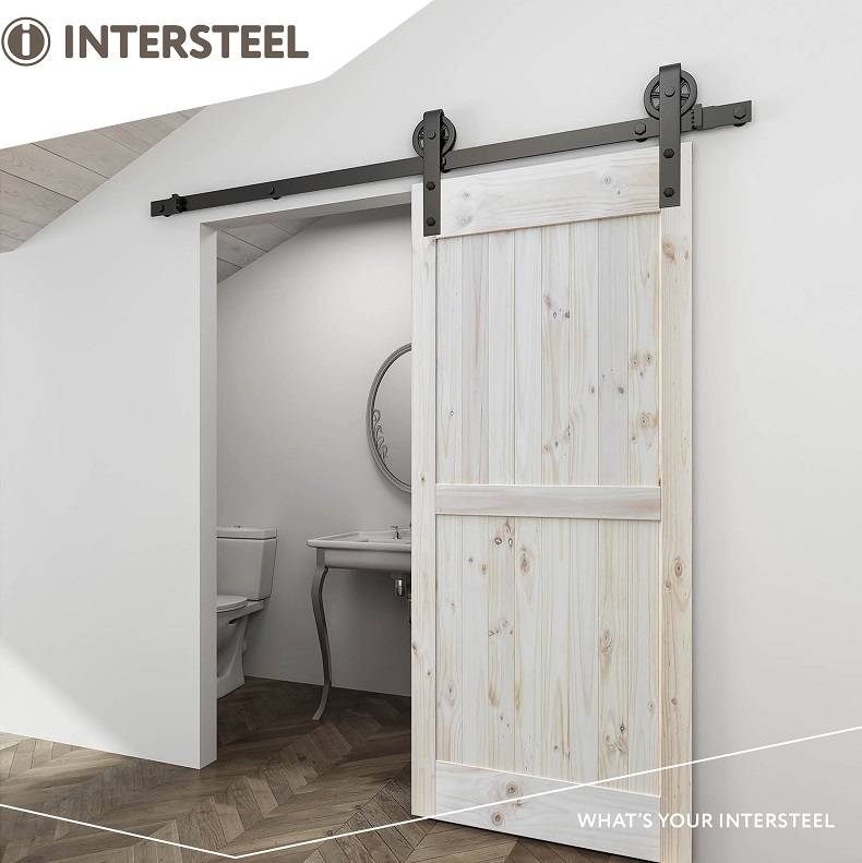 It is a modern sliding door system with large spoked wheels that consists of two 100 cm steel rails.