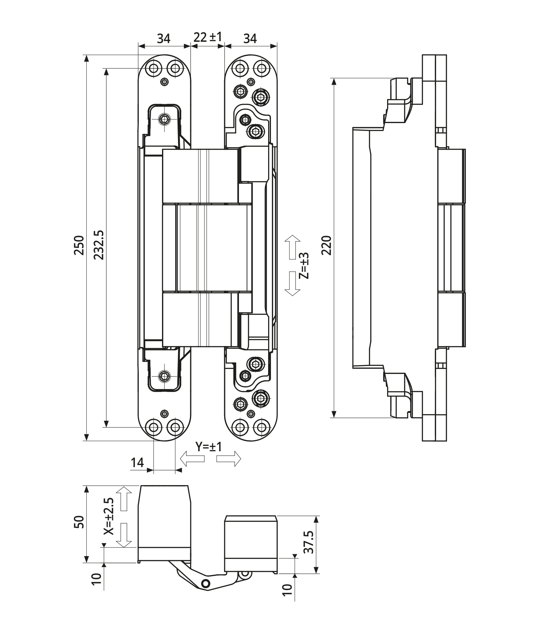 Description Heavier Otlav invisible 3D hinge IN343250 - 250x34mm in matt black suitable for gates and heavy doors - 200 kg load capacity with 2 hinges