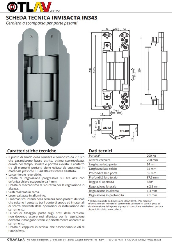 The hinge weighs 2,500 grams, demonstrating the robust and durable quality for which OTLAV is known. Each hinge is supplied complete with screws and cover caps, making installation simple and efficient – without the need for any additional parts.
