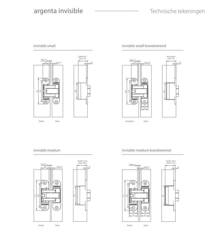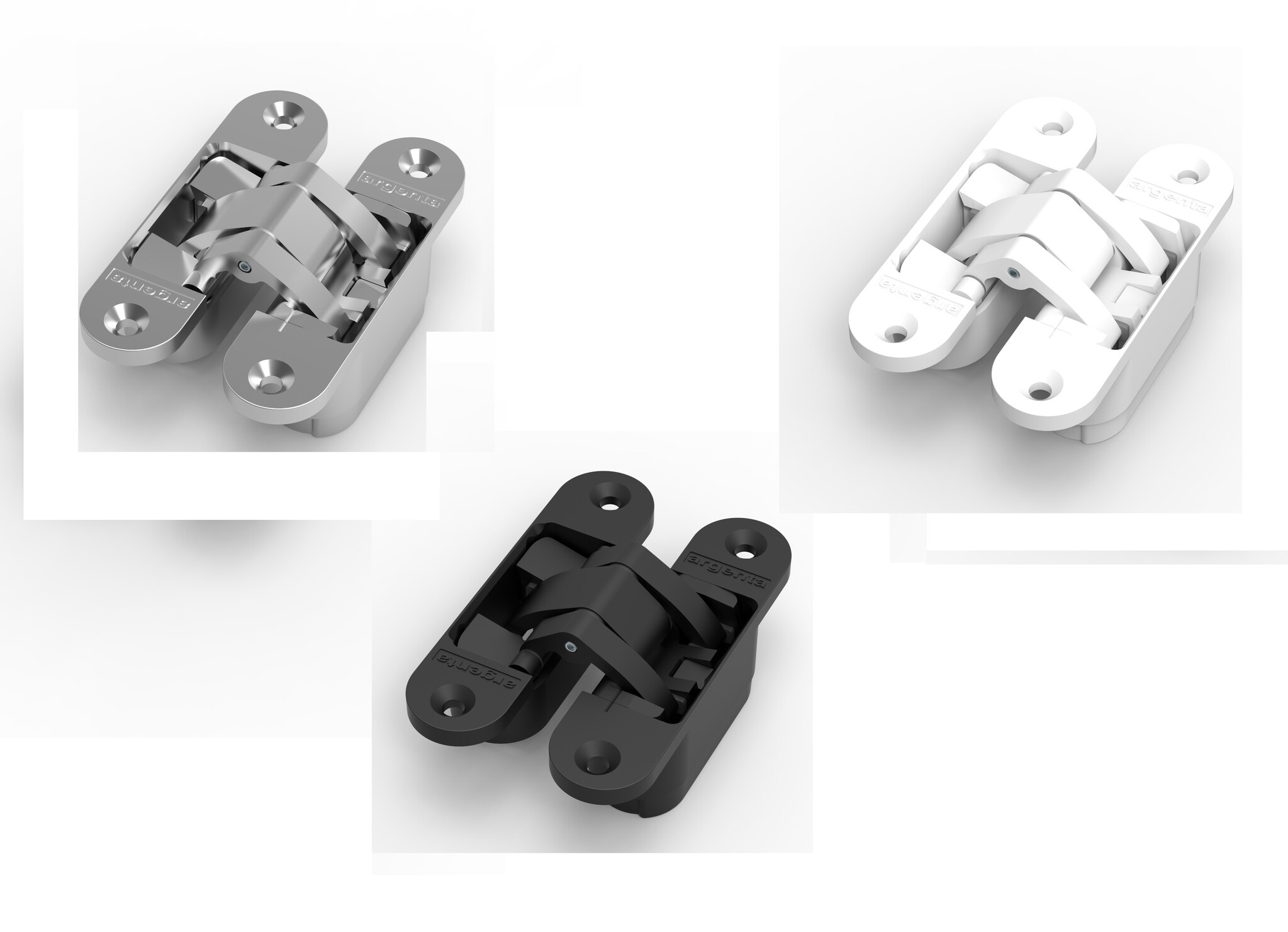 Description Invisible 3D hinge from Argenta - Small - 95x23mm available in white, black and matt chrome - 45 kg load capacity with 2 hinges