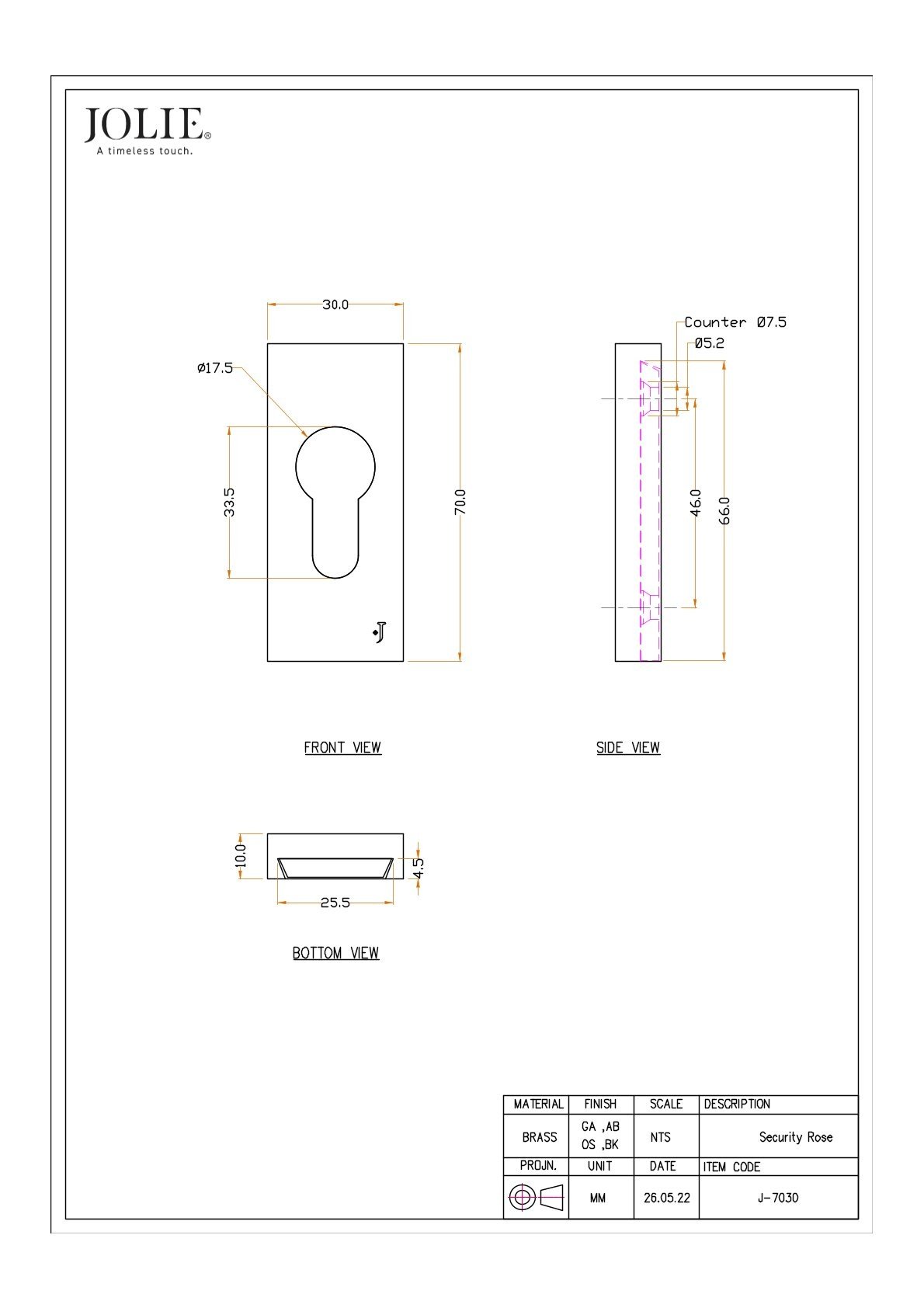 The Jolie security escutcheon protects the cylinder of your exterior door against manipulation and burglary. Measuring 70x30 mm , 10 mm thick , and with a 17.5 mm cylinder hole , it fits perfectly over the door cylinder. The sturdy material ensures that screws are inaccessible from the outside, providing extra security for your door.