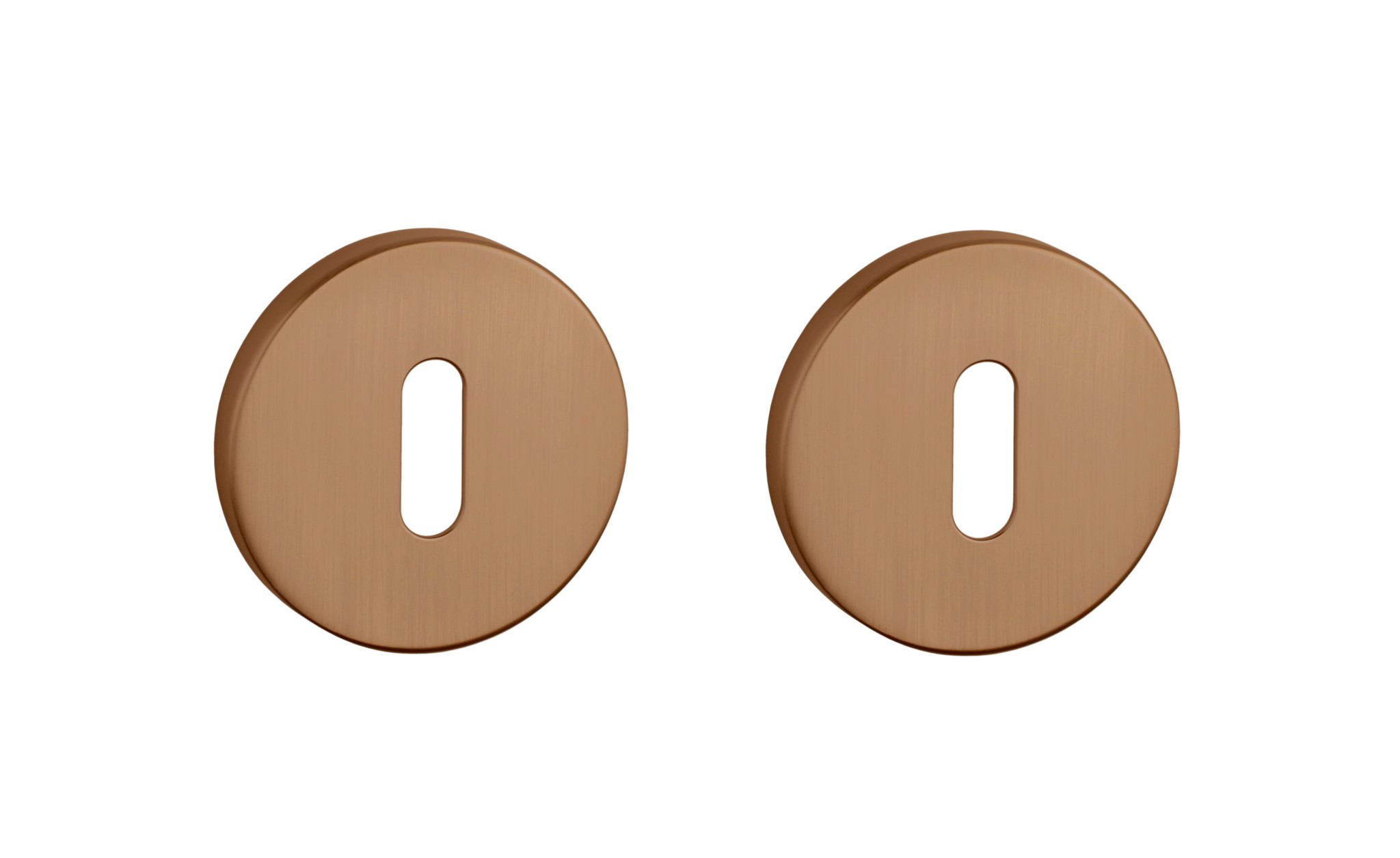These round escutcheons in matt copper have a Ø 52 mm and a thickness of only 7 mm so that they look aesthetically pleasing on the doors.