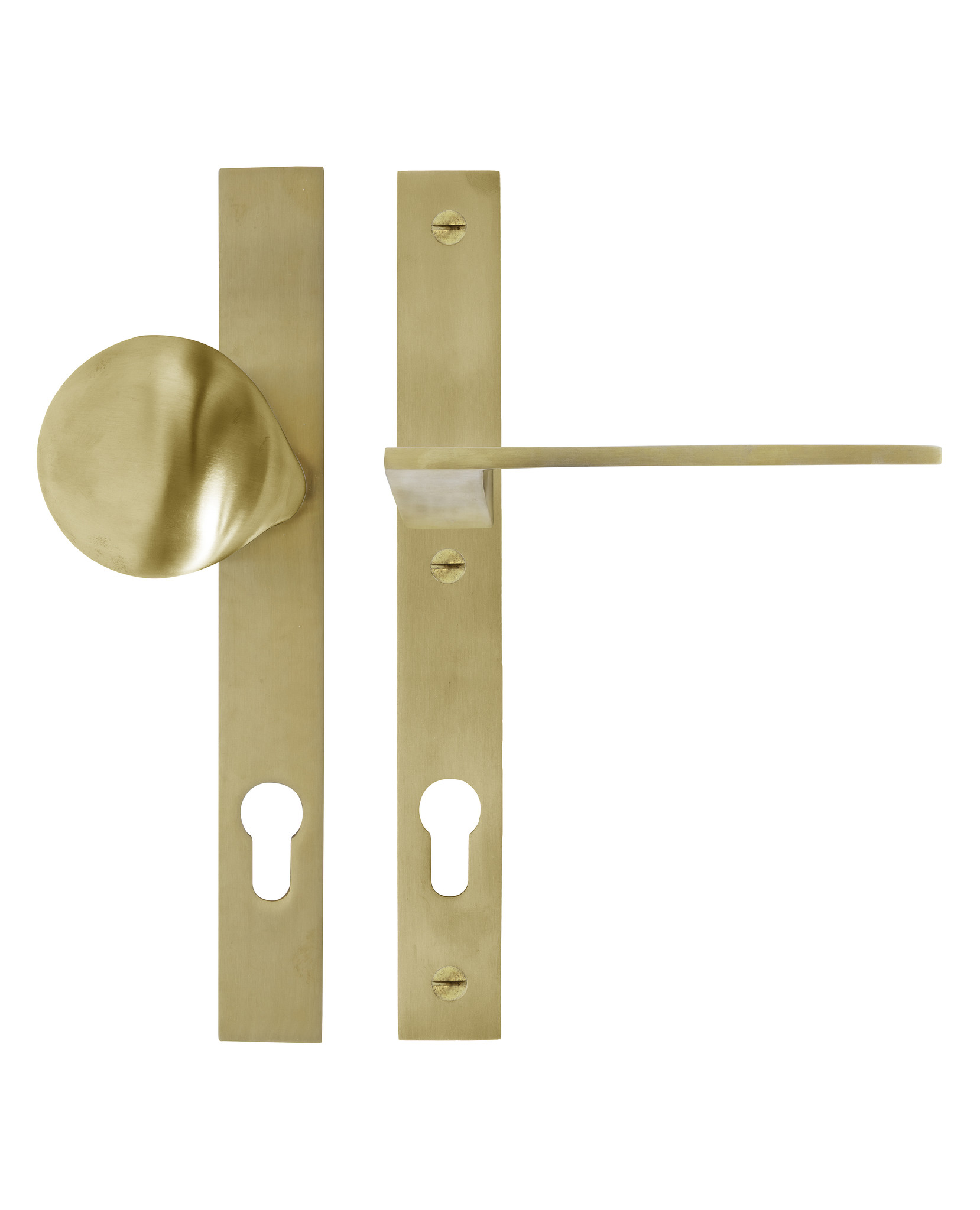 The combination doorknob/door handle is mounted on a straight shield of 30x250 mm that is 7 mm thick on the outside and 10 mm on the inside. Three points are provided for through fastening.