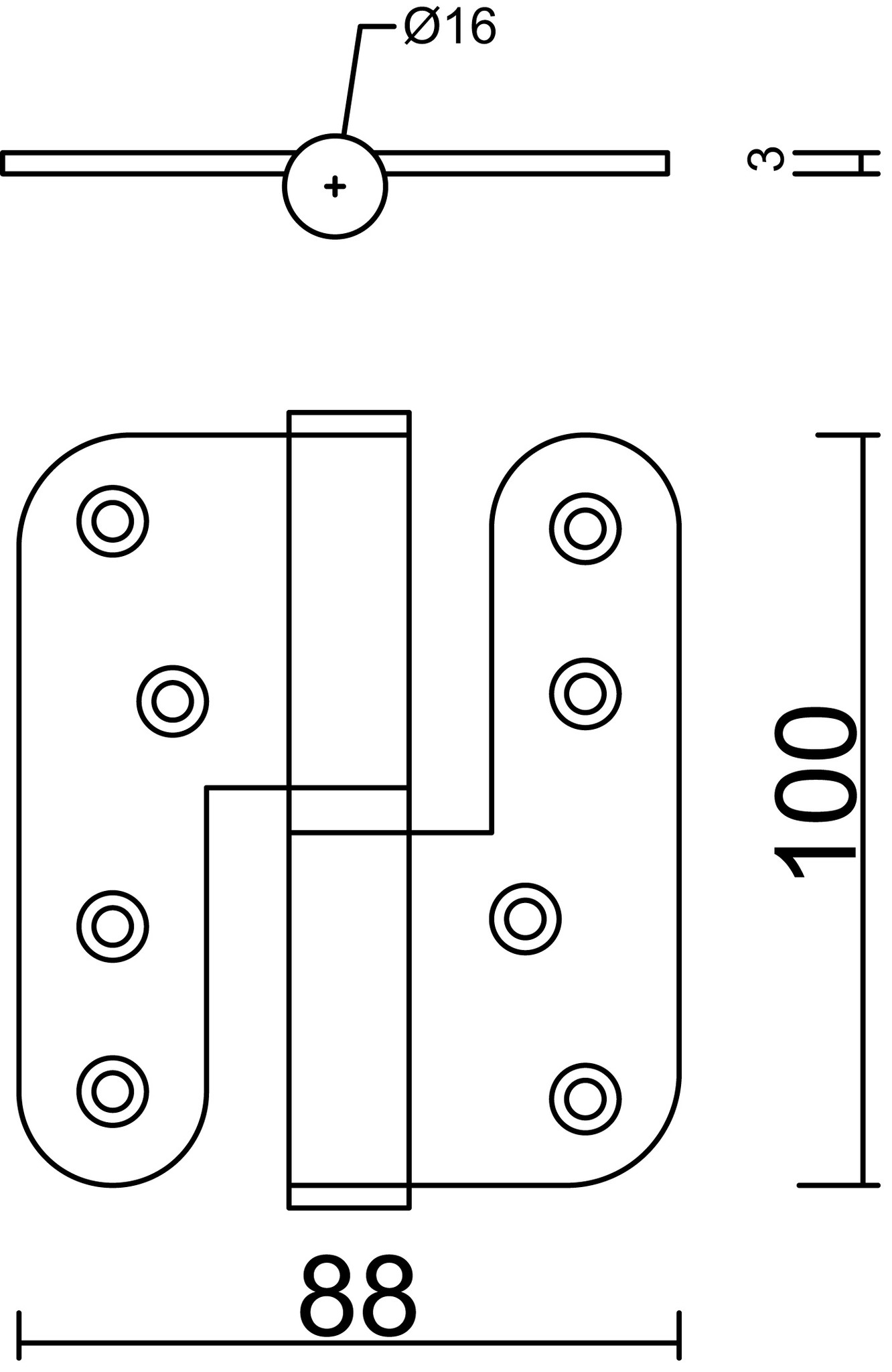 These stainless steel hinges have the following dimensions 100x88x3.5mm and have a matt black finish (RAL9005).
