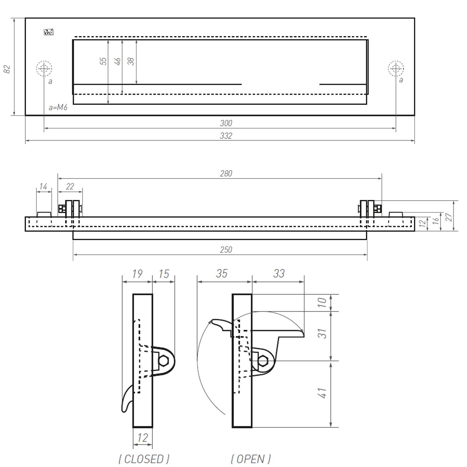The total width is 332mm and the height is 82mm. The mounting points are 300mm apart.