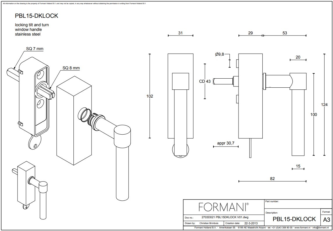 The window handle with stainless steel base and finished with a light bronze PVD coating is supplied per piece, including mounting material, key and a 7x7 mm pin. If necessary, the pin can be shortened by a length of 45 mm.