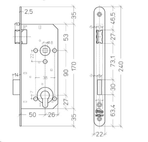 Cylinder lock from Litto for interior doors with a rounded counter plate of 240x22mm.