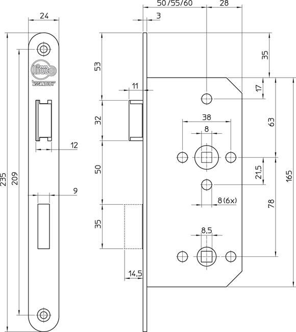 The different types of locks have the same dimensions of cabinet, front and closing plate, so that one can switch from lock type without adjusting the door leaf.