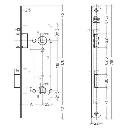 This toilet lock has 2 square holes of 8x8mm and is supplied without a striker plate.