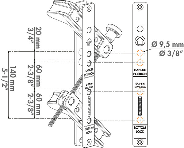 The case contains a drilling template that clamps firmly on both round and rectangular profiles, which ensures perfect alignment of the holes to be drilled. In addition, the case contains all the necessary accessories for quick installation and adjustment, making the entire process efficient.