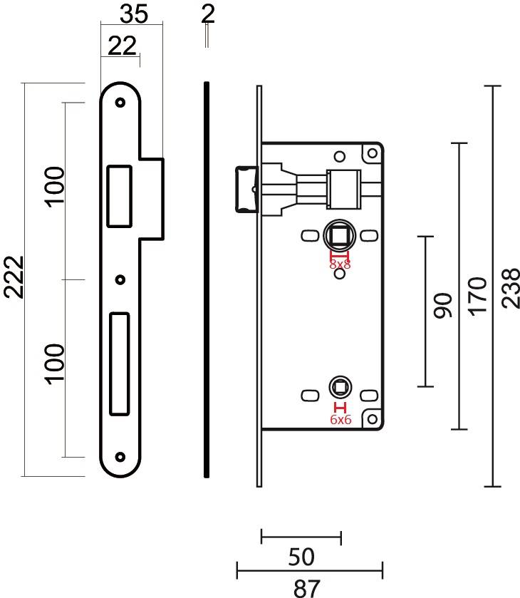 The width of the counter plate is 22mm and the height is 238mm. These locks are supplied with the corresponding striker plate and screws.