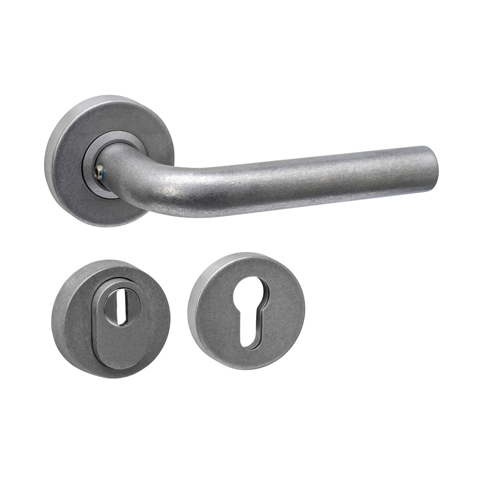 Back door fitting 'LUZERN' security fittings feature a solid round rosette with a tumbled finish and PVD coating for durability and style. The integrated spring ensures the door handle returns smoothly to a horizontal position. The complete set also includes the security cylinder plates and all necessary mounting materials for easy installation.