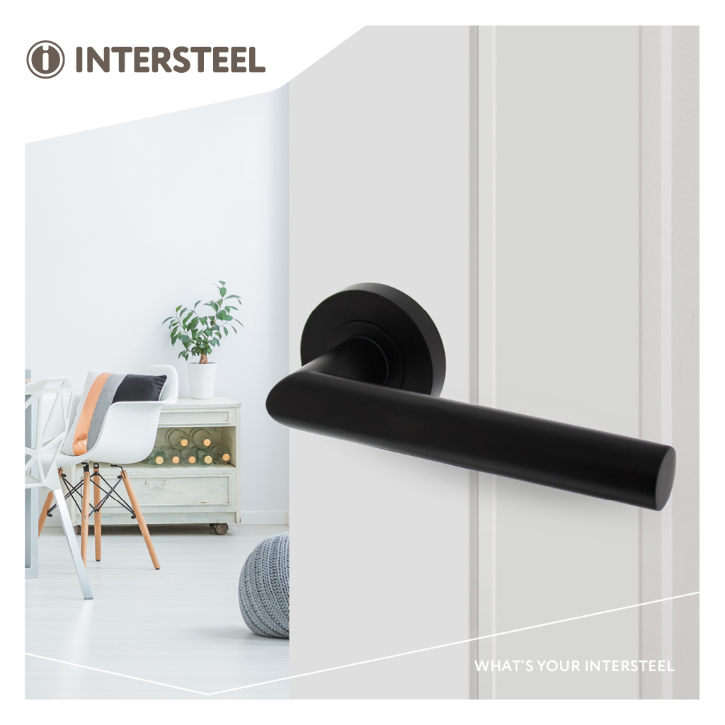 Description Solid door handle "Bastian" on round rosette 53x8mm with matt black cams