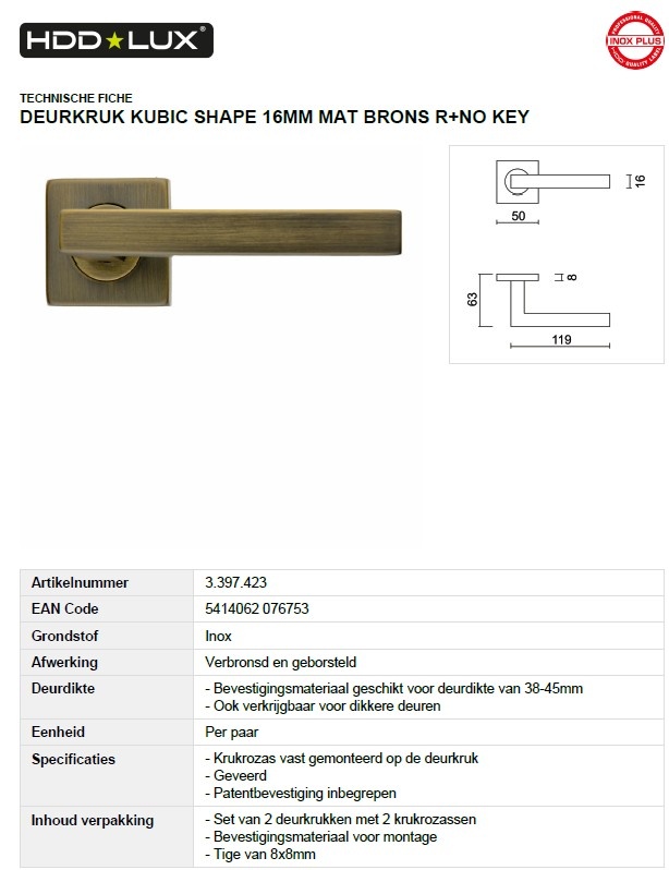 The matt bronze door handles are supplied per pair, including mounting materials and an 8x8 mm square pin.