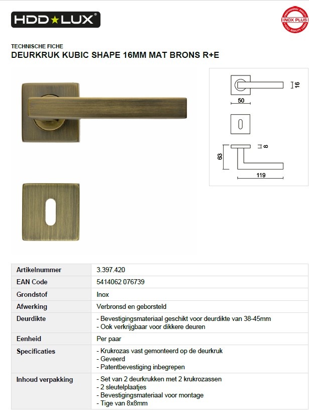 Pair of HDD bronze door handles KUBIC SHAPE 16mm on square rosettes made of stainless steel with a special bronze finish