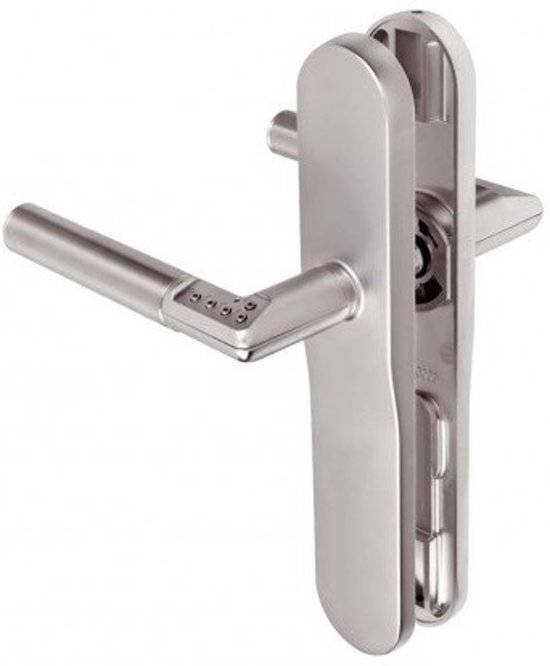 The door handle has 5 keys. One key to lock the door and 4 keys to enter a user code. By entering the correct code, the handle control is linked to the lock. The user can therefore open the door with one lever movement.