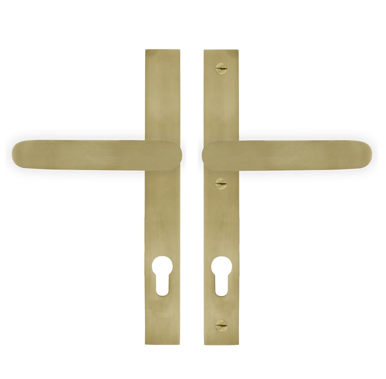 The pair of rounded door handles stand on a straight shield of 250x30 mm that is 7 mm thick on the outside and 10 mm on the inside. Three mounting points are provided for continuous mounting.