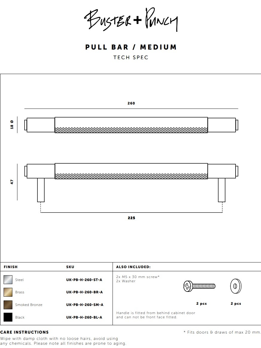 These smoked bronze furniture handles have Buster+Punch's signature diamond-cut cross pattern and have been refined by hand. They fit great on cupboard doors, wardrobes, kitchen units, appliances and long drawers.