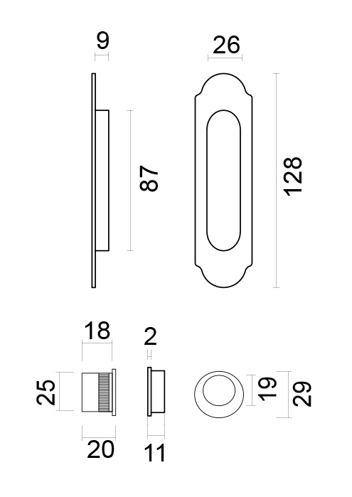 2 pieces with a height of 128 mm, a width of 29 mm and a depth of 9 mm.