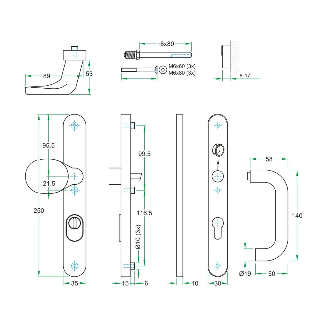 The concealed screw mounting inside the door plate creates a sleek and modern look, with no visible fixing points. Suitable for door thicknesses of 37-57 mm and applicable to aluminum, wood, PVC, and steel doors, this hardware is versatile and suitable for both residential and healthcare settings, as well as various types of buildings with heavy use.