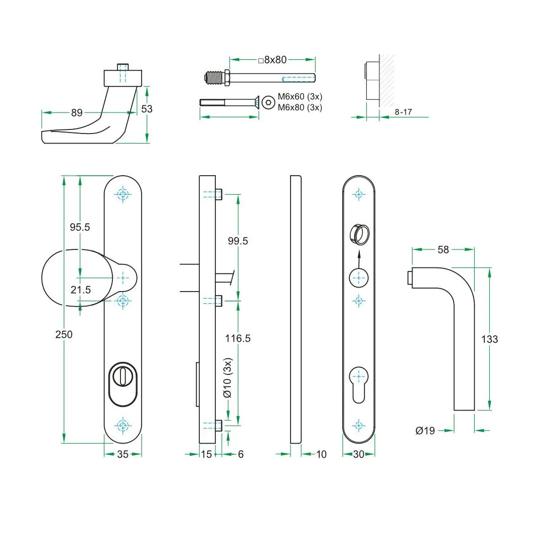 The concealed screw mounting inside the door plate creates a sleek and modern look, with no visible fixing points. Suitable for door thicknesses of 37-57 mm and applicable to aluminum, wood, PVC, and steel doors, this hardware is versatile and suitable for both residential and healthcare settings, as well as various types of buildings with heavy use.