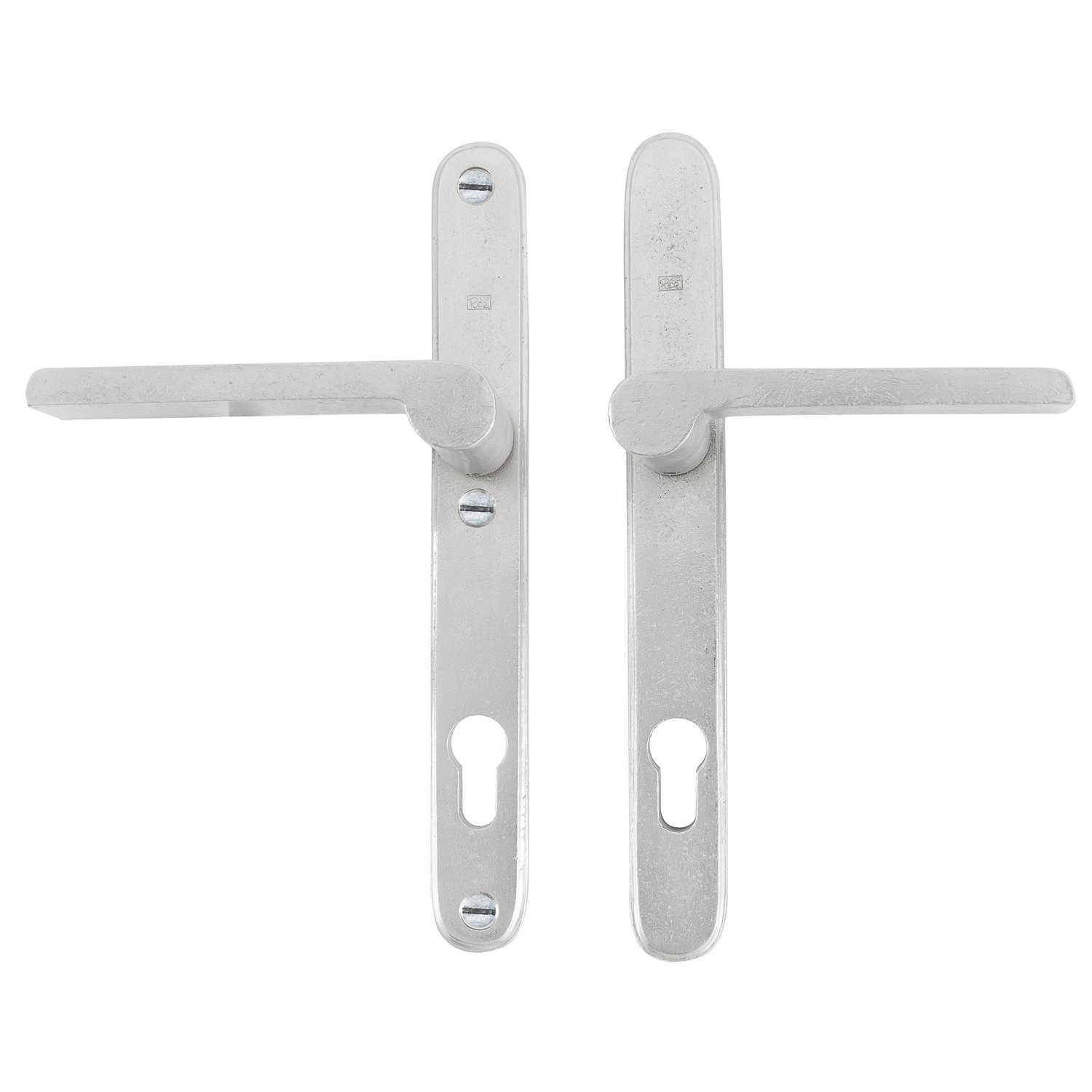 These silver-coloured safety fittings are not sprung and are supplied with mounting materials. The national security fittings are suitable for three-point locks.
