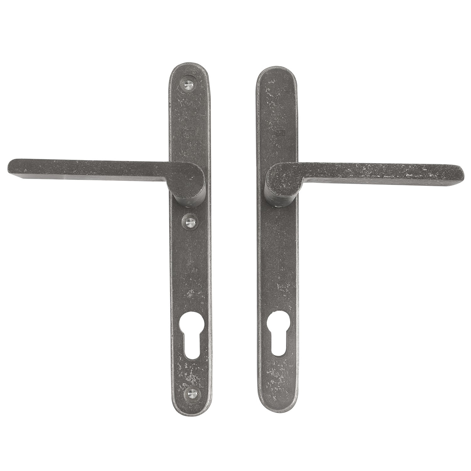 Narrow shield safety fitting in raw metal which is equipped with 2x a door handle PH1928 with a PZ axle size of 72, 92 or 110mm