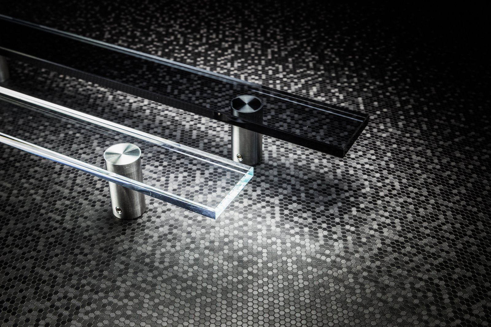 This innovative door handle is made of stainless steel combined with graphite-colored glass. The feet of the door handle are made of brushed stainless steel. The door handle itself is made of anthracite gray glass with a thickness of 10mm, which provides a sturdy look.
