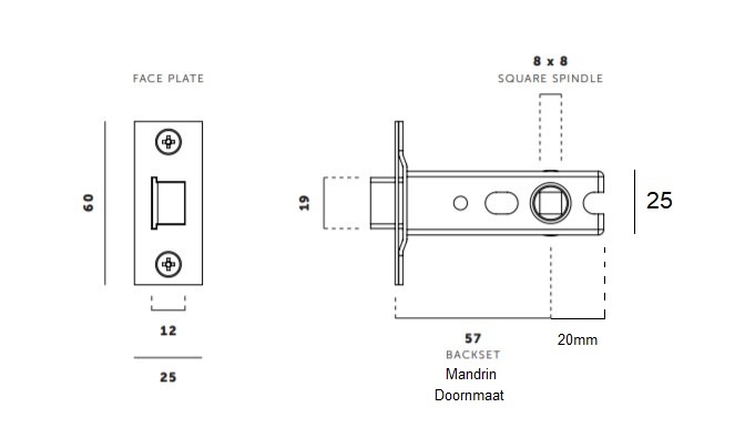The straight brass front plate is 25x60mm (width x height) and the total installation depth of the lock itself is 25x80mm. (height x depth).