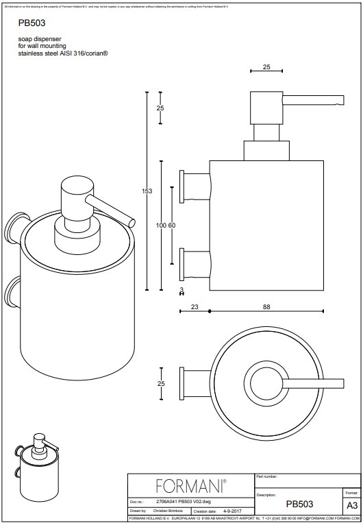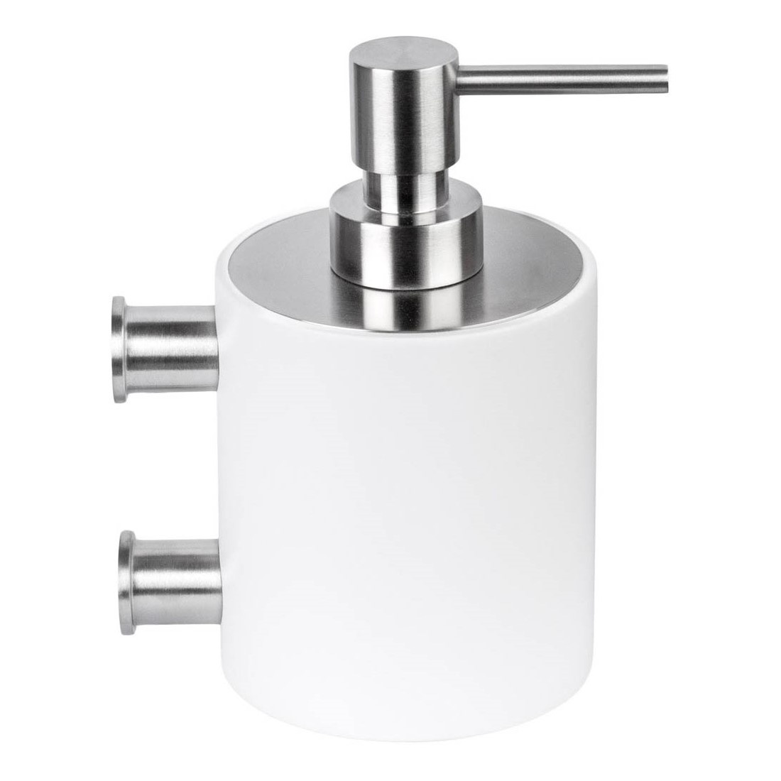 Beautiful soap dispenser made of solid stainless steel combined with white Corian. This item is a practical and stylish tool designed by Piet Boon to dose liquid soap efficiently and hygienically.