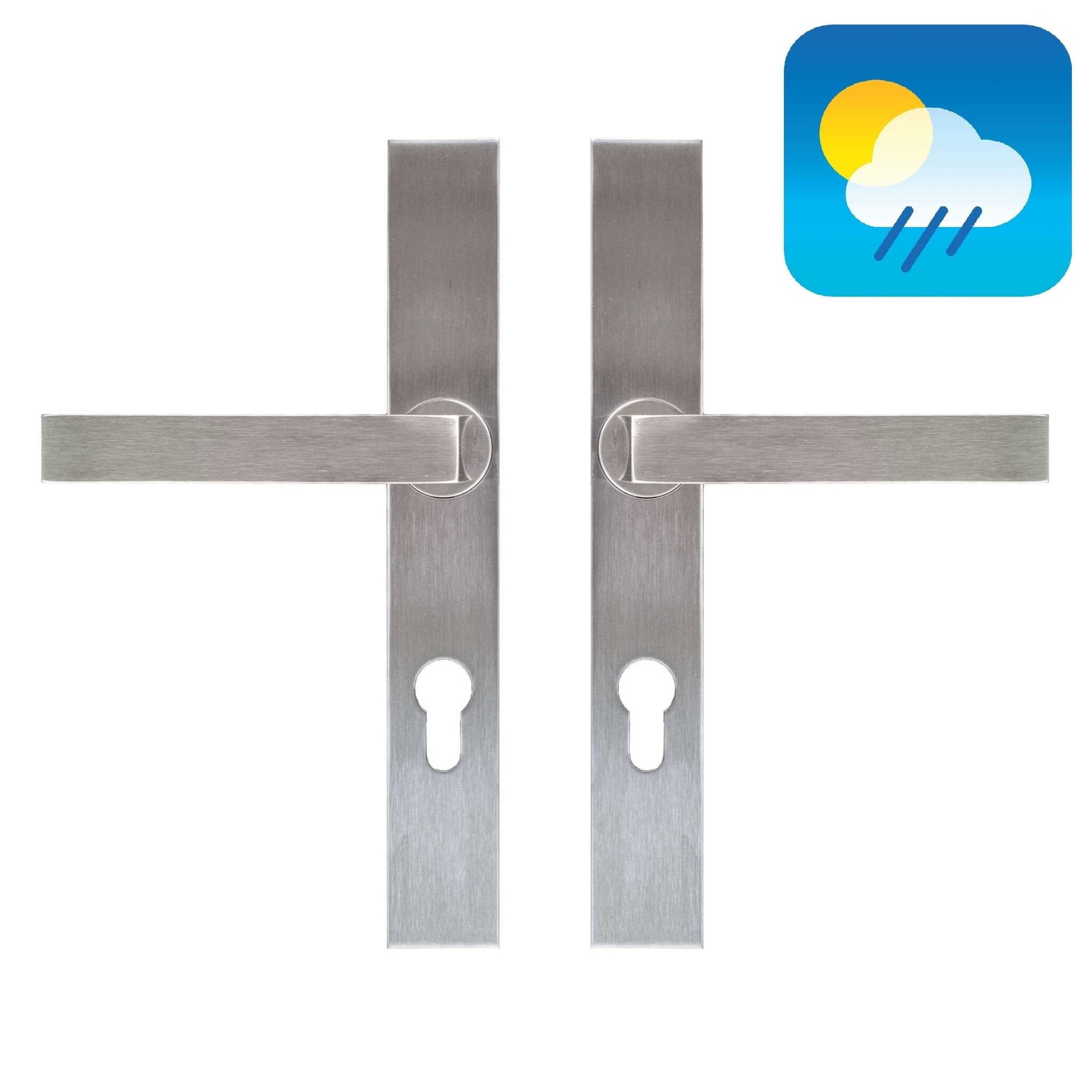 Door fittings on a straight shield are often used for renovations because they cover the holes of the previous handles.