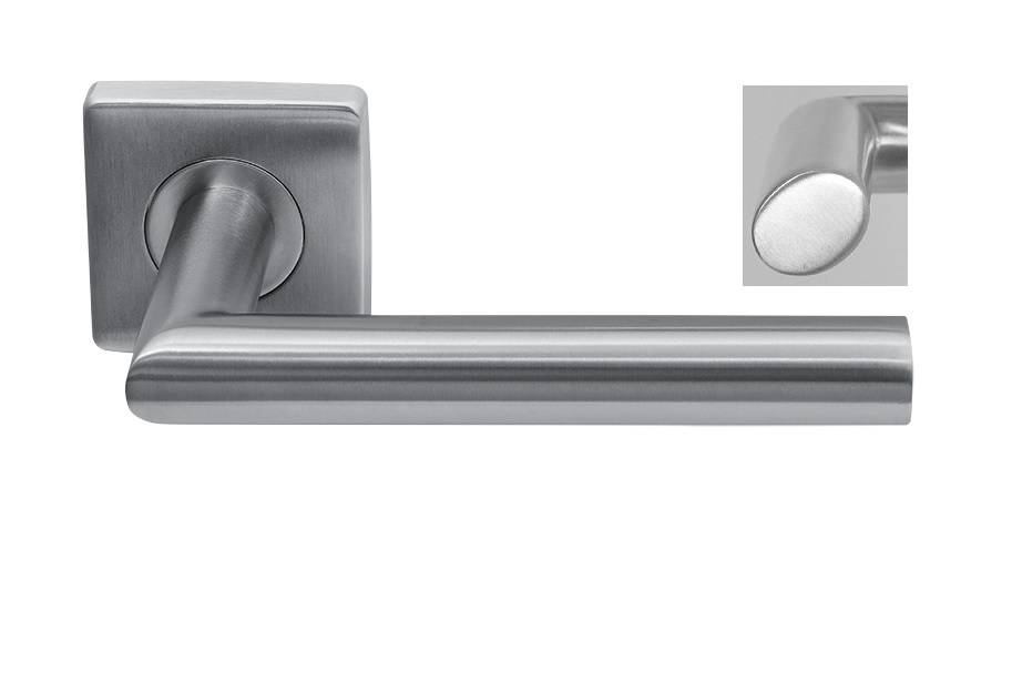 These stainless steel design door handles have an oval handle and stand on a square rosette (53mm).
