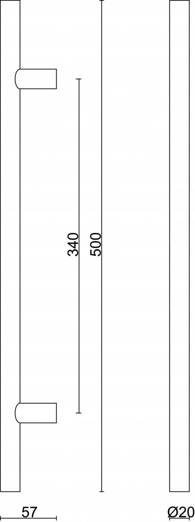 This single stainless steel door handle has a diameter of 20 mm and an axle size of 340 mm. In its entirety, this door handle comes forward 57 mm.