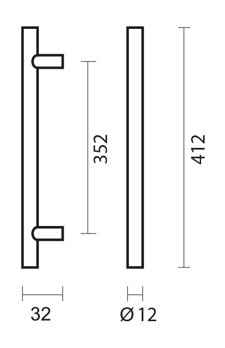 The shaft size is 352 mm (B) and the total width of the case handle is 412 mm (C).