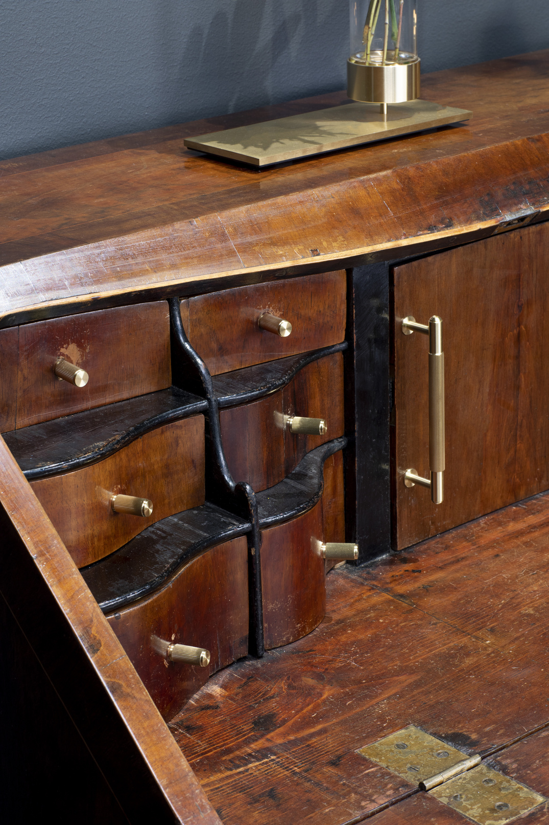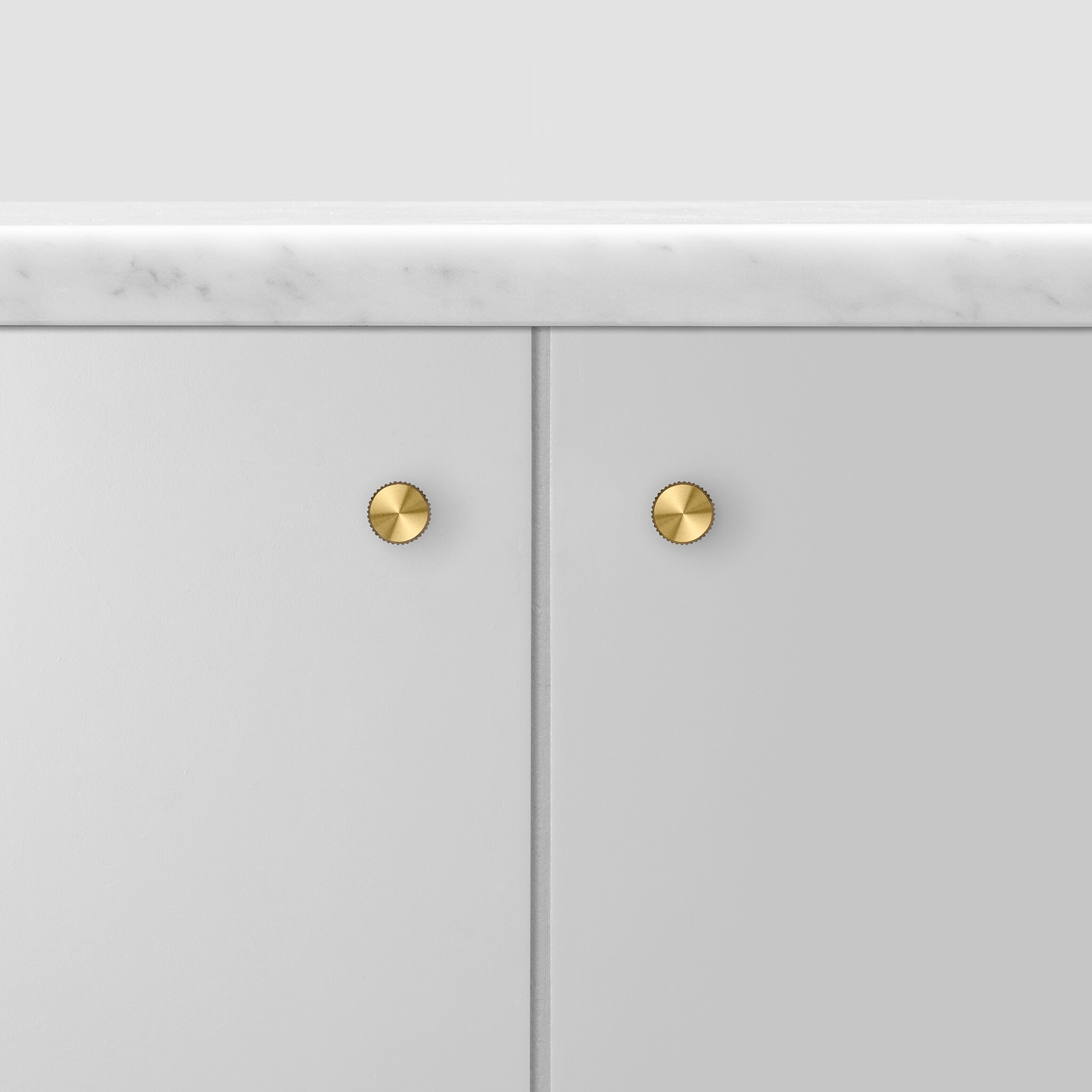 A pair of furniture knobs made of solid brass. These knobs have our signature diamond-cut linear knurling pattern and are refined by hand.