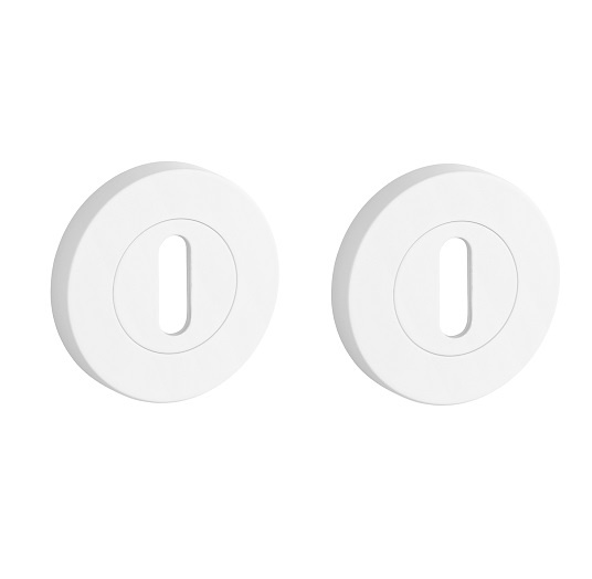 These matte white key plates belong to the PRO 8 MM series from STERK (class 4 EN1906:2012). The rosettes have a Ø 51.5mm and are 8mm thick.