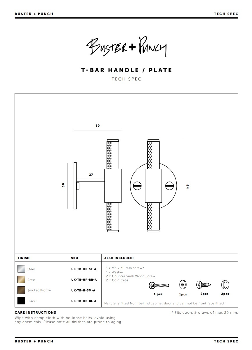 The brass T-bar furniture handles are supplied per piece including mounting materials (1 x M5 x 30mm).