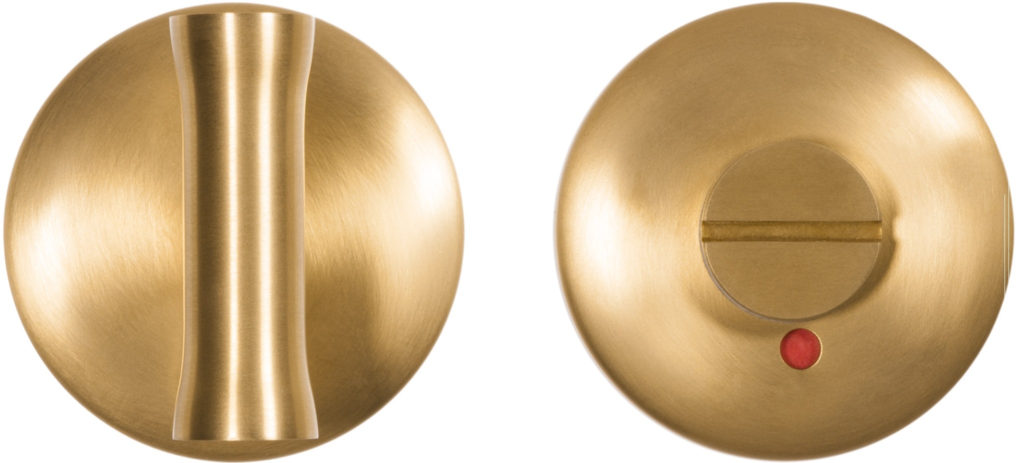 This matt gold toilet set has a diameter of 52 mm and is only 6 mm thick. Characteristic of this toilet set is the beautiful finish. There is a subtle red indication when the toilet or bathroom is occupied.