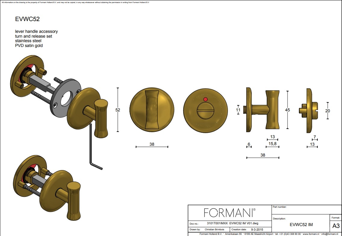 This matt gold EVWC52 WC set, designed by Edward Van vliet, is supplied as a set including mounting materials and pin for openings of 5/6/7 and 8 mm.