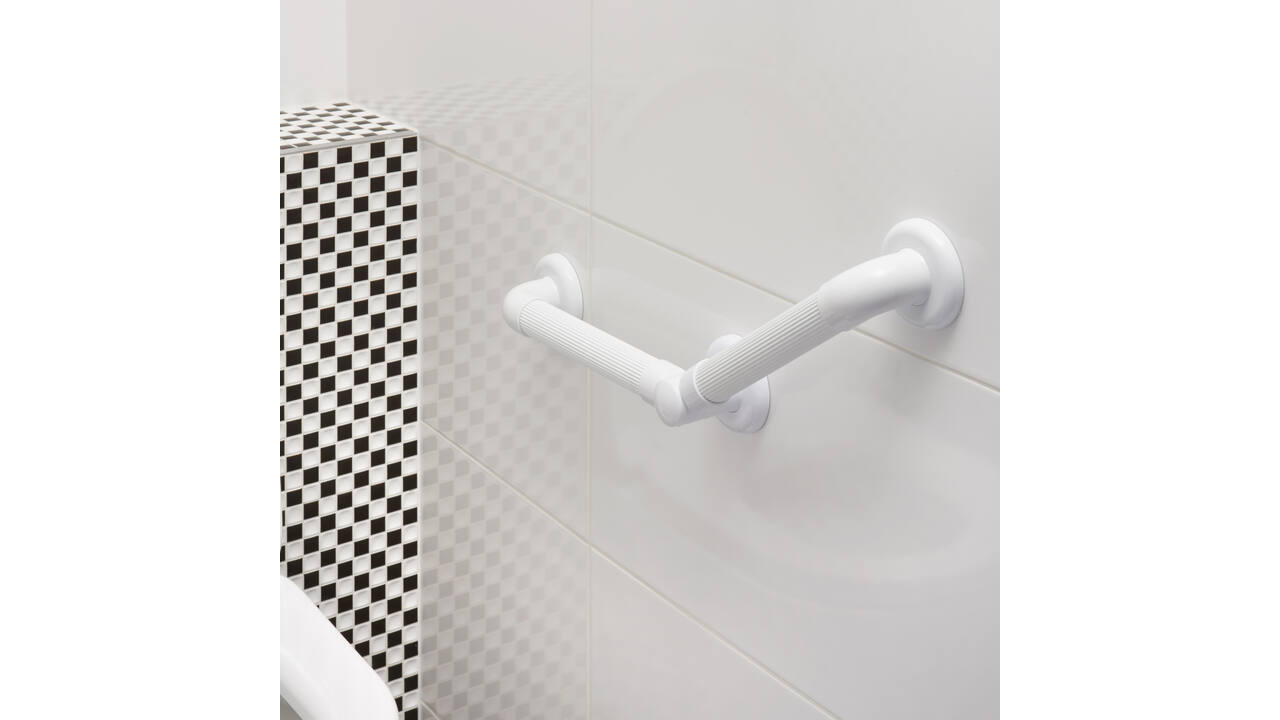 The grab rail is made of high-quality, impact-resistant ABS plastic and features a ribbed grip for optimal grip, even in damp areas such as bathrooms or toilets. The grab rail can be shortened and mounted at any desired angle, making it versatile for use in showers, bathtubs, stairs, or on walls.