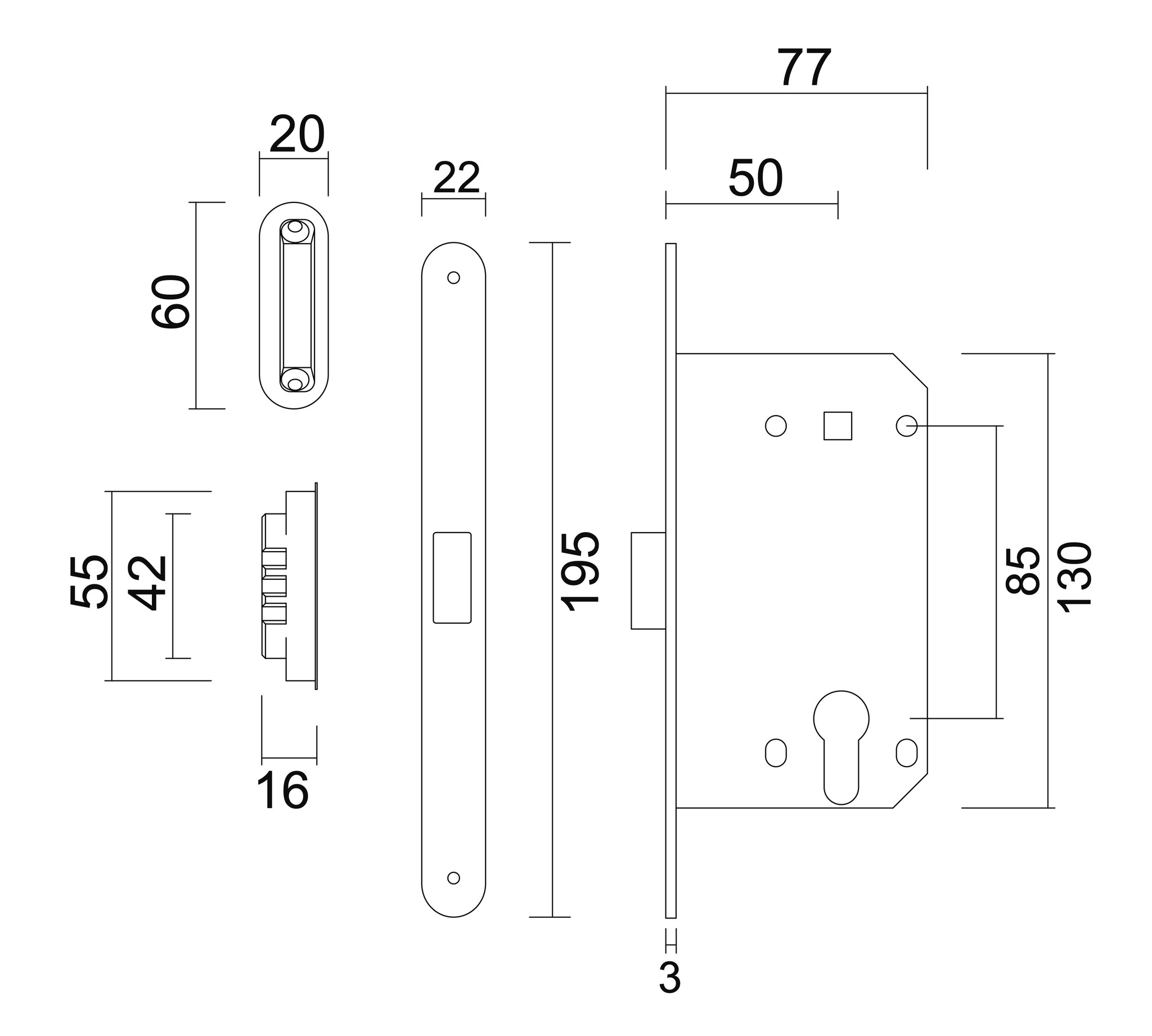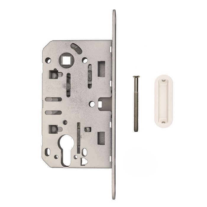 This AGB magnetic lock with cylinder opening has a white front plate 22 mm wide and 195 mm high. The axle is 85 mm and the backset is 50 mm.