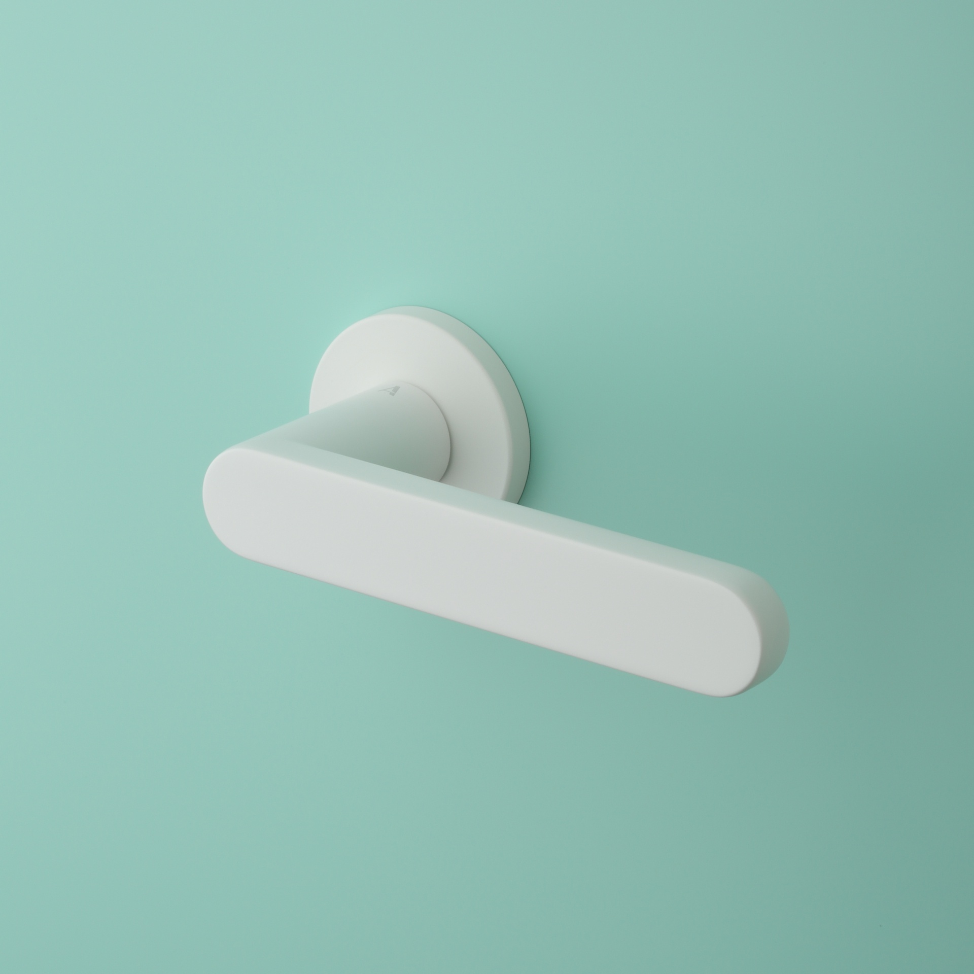 These matt white door handles with the Aprile logo have a solid Zamak base and are then provided with a matt white coating.