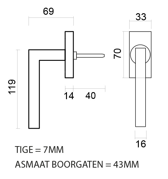 The handle is mounted on a rectangular rosette of 33 x 70 mm. The mounting holes are spaced 43 mm apart, ensuring easy installation. Supplied individually, including mounting hardware and a corresponding spindle of 7x7x40 mm.