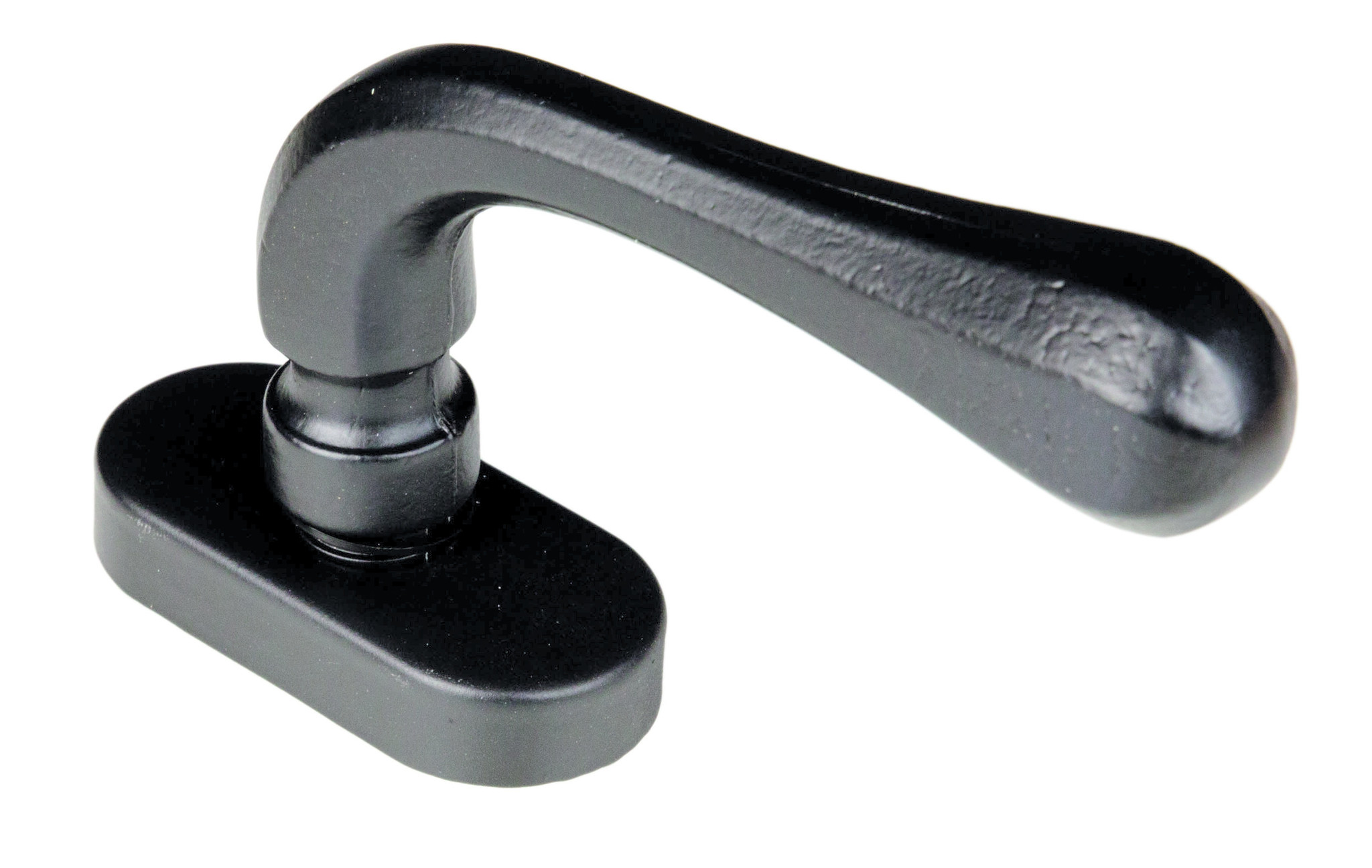 Classic black window handle in tilt and turn version (DK stands for tilt and turn). This window handle is 'tumbled' which creates small dents and gives these black window handles an older look. This makes them look like cast iron window handles.